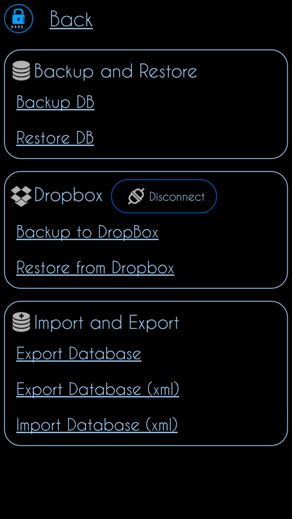 Database backup and restore on file. Export decrypted database to text file. Backward compatibility of newer versions.